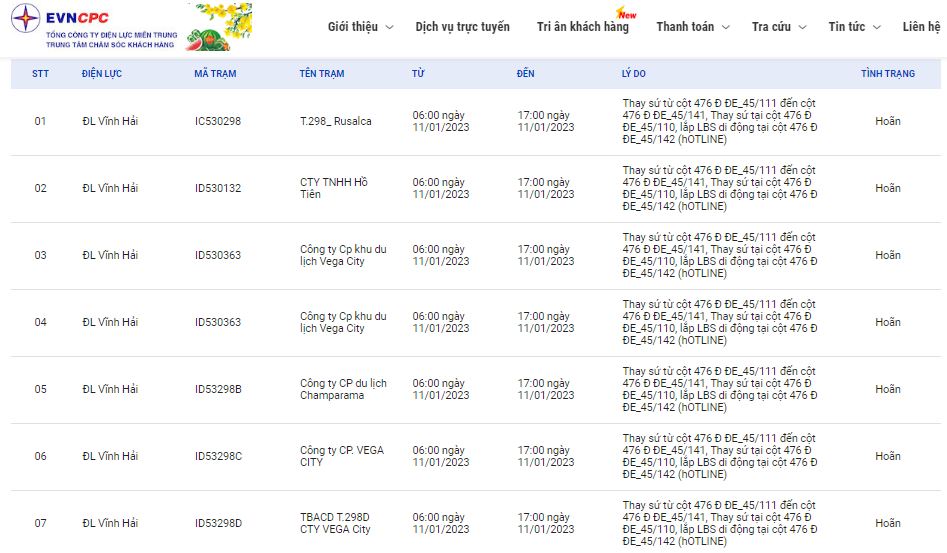 | ĐL Vĩnh Hải | ID53298C | Công ty CP. VEGA CITY | 06:00 11/01/2023 | 17:00 11/01/2023 | Thay sứ từ cột 476 Đ ĐE_45/111 đến cột 476 Đ ĐE_45/141, Thay sứ tại cột 476 Đ ĐE_45/110, lắp LBS di động tại cột 476 Đ ĐE_45/142 (hOTLINE) |