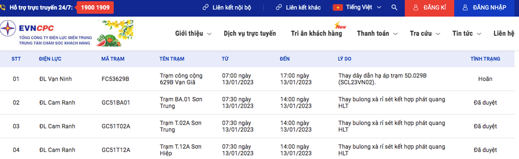 | 3 | ĐL Cam Ranh | GC51T02A | Trạm T.02A Sơn Trung | 07:30 13/01/2023 | 14:00 13/01/2023 | Thay bulong xà rỉ sét kết hợp phát quang HLT | Đã duyệt |