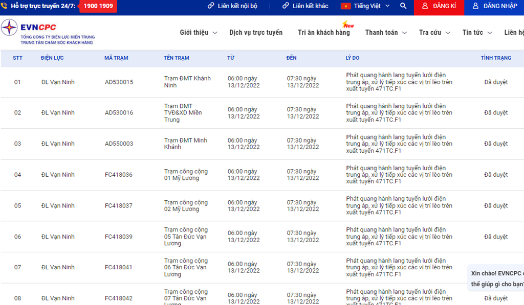 | 6 | ĐL Vạn Ninh | FC418039 | Trạm công cộng 05 Tân Đức Vạn Lương | 06:00 13/12/2022 | 07:30 13/12/2022 | Phát quang hành lang tuyến lưới điện trung áp, xử lý tiếp xúc các vị trí lèo trên xuất tuyến 471TC.F1 | Đã duyệt |