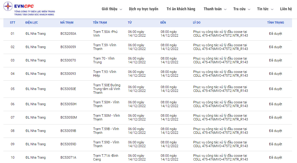 | 10 | ĐL Nha Trang | BC53071A | Trạm T.71A -Bình Cang | 06:00 14/12/2022 | 08:00 14/12/2022 | Phục vụ công tác xử lý đầu cosse tại CDLL 475-476MVO-475T2.NTR_R143 |