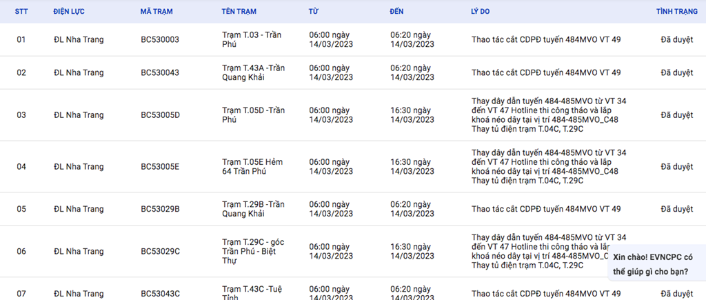 | 2 | Điện lực Liên Chiểu | HC53HN19 | KĐT Phước Lý T2 | 06:30 14/03/2023 | 11:30 14/03/2023 | Lắp MC thay thế FCO đầu tuyến tại cột 124/2 - 479 T2.HKH (Lắp MC loại Noza)Thí nghiệm CBM Tier 2 TBA Đà Sơn 5, Nguyễn Minh Chấn, Khu phức hợp DVTM, Hoàng MinhThảo - 479 T2.HKH | Đã duyệt |