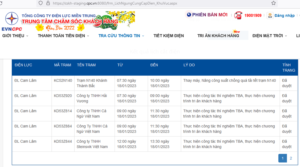 | ĐL Cam Lâm | KC52N140 | Trạm N140 Khánh Thành Bắc | 07:30 ngày 18/01/2023 | 10:00 ngày 18/01/2023 | Thay máy, Nâng công suất chống quá tải tết trạm N140 | Đã duyệt |