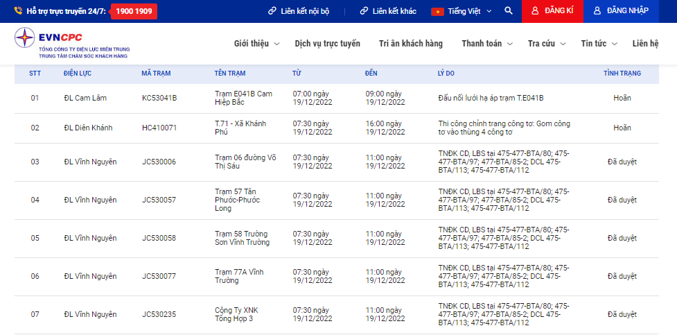 | ĐL Cam Lâm | KC53041B | Trạm E041B Cam Hiệp Bắc | 07:00 19/12/2022 | 09:00 19/12/2022 | Đấu nối lưới hạ áp trạm T.E041B |