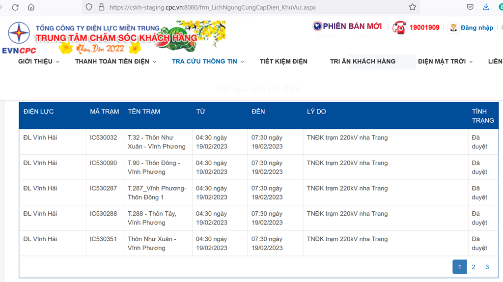 | ĐL Vĩnh Hải | IC53286E | Tram công cộng 286E | 04:30 ngày 19/02/2023 | 07:30 ngày 19/02/2023 | TNĐK trạm 220kV nha Trang | Đã duyệt |
