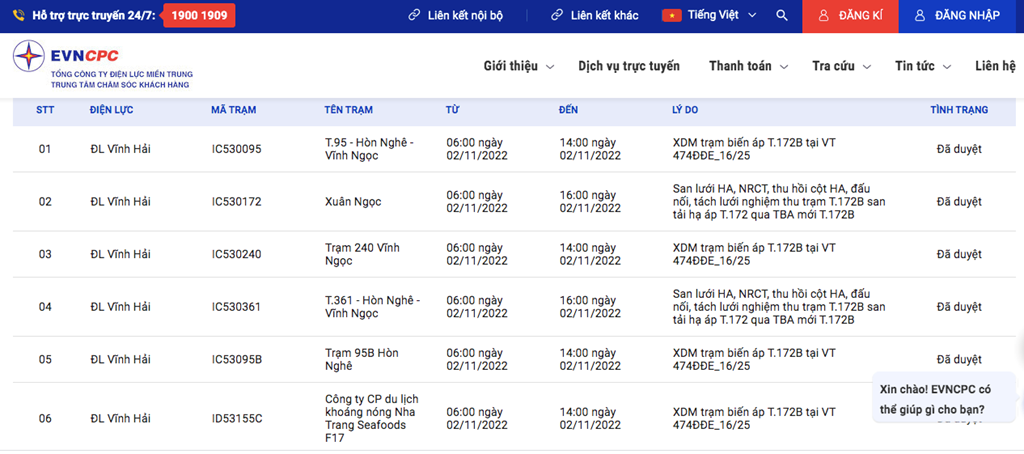 | 5 | ĐL Vĩnh Hải | IC53095B | Trạm 95B Hòn Nghê | 06:00 02/11/2022 | 14:00 02/11/2022 | XDM trạm biến áp T.172B tại VT 474ĐĐE_16/25 | Đã duyệt |