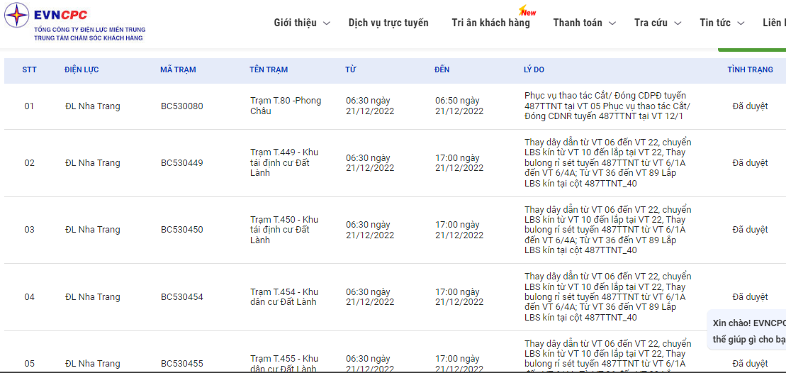 | ĐL Nha Trang | BC530449 | Trạm T.449 - Khu tái định cư Đất Lành | 06:30 21/12/2022 | 17:00 21/12/2022 | Thay dây dẫn từ VT 06 đến VT 22, chuyển LBS kín từ VT 10 đến lắp tại VT 22,Thay bulong rỉ sét tuyến 487TTNT từ VT 6/1A đến VT 6/4A; Từ VT 36 đến VT 89Lắp LBS kín tại cột 487TTNT_40 | Đã duyệt |