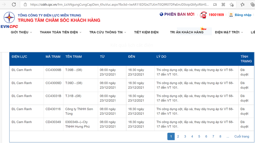 | ĐL Cam Lâm | KC53F046 | Trạm F046 Tân Sinh 2-CTB | 07:00 ngày 23/12/2021 | 16:30 ngày 23/12/2021 | Dựng, trụ, lắp xà, chụp đầu cột, thay dây nhánh rẽ 473BĐCR_182 | Đã duyệt |