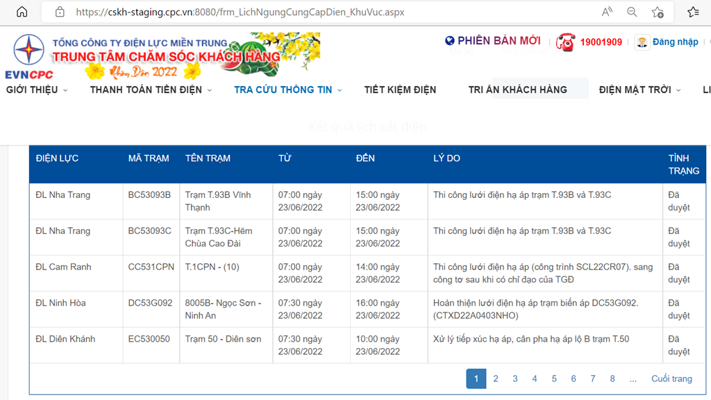 | ĐL Nha Trang | BC53093C | Trạm T.93C-Hẽm Chùa Cao Đài | 07:00 ngày 23/06/2022 | 15:00 ngày 23/06/2022 | Thi công lưới điện hạ áp trạm T.93B và T.93C | Đã duyệt |