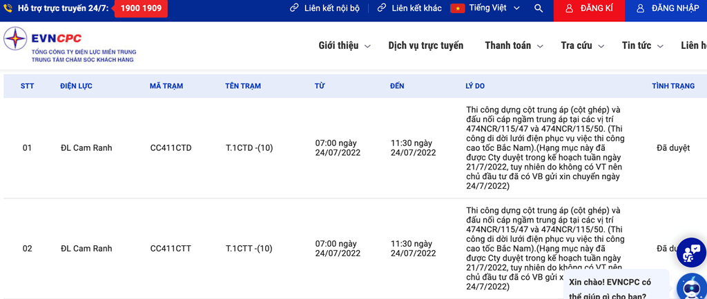 Lịch cắt điện Khánh Hòa trên website của EVNCPC. Ảnh: BNEWS