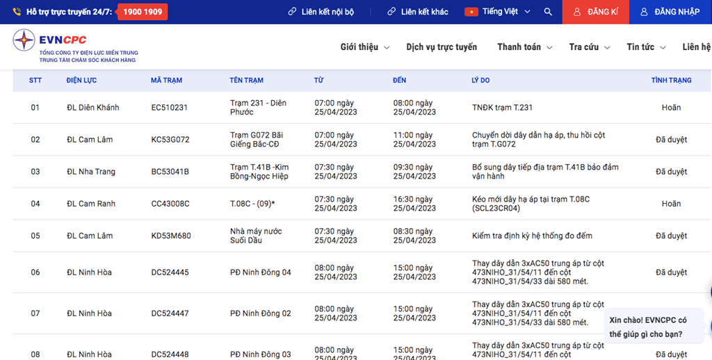 | 10 | ĐL Diên Khánh | EC510226 | Trạm 226 - Diên Phước | 08:00 25/04/2023 | 09:00 25/04/2023 | TNĐK trạm T.226 | Hoãn |