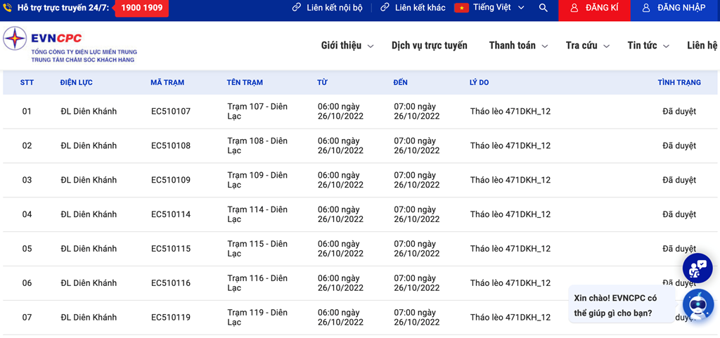 Lịch cắt điện Khánh Hòa trên website của EVNCPC. Ảnh: BNEWS