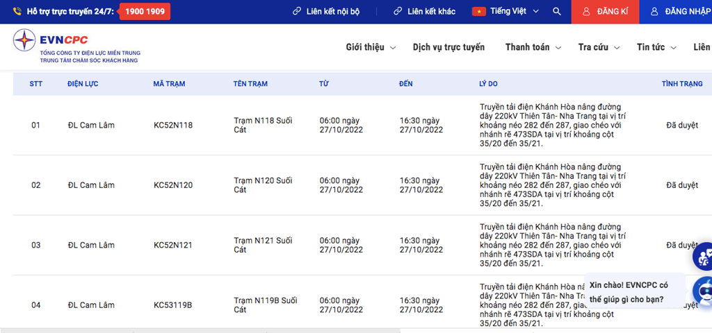 | 2 | ĐL Cam Lâm | KD53N636 | Công ty TNHH Nuôi Trồng Thủy Sản Vạn Xuân | 06:00 27/10/2022 | 16:30 27/10/2022 | Truyền tải điện Khánh Hòa nâng đường dây 220kV Thiên Tân- Nha Trang tại vị trí khoảng néo 282 đến 287, giao chéo với nhánh rẽ 473SDA tại vị trí khoảng cột 35/20 đến 35/21. | Đã duyệt |