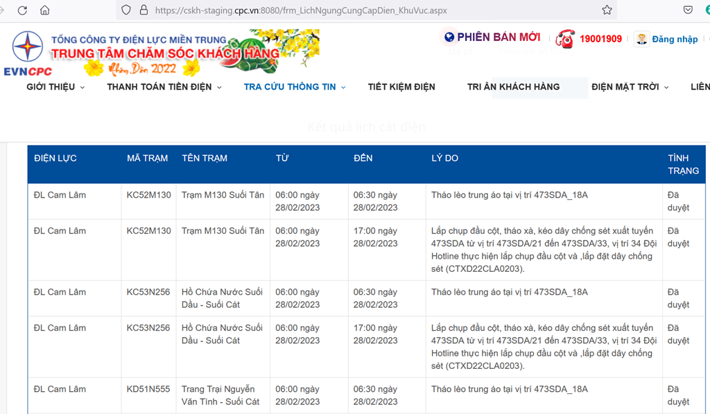 | ĐL Cam Lâm | KC52M130 | Trạm M130 Suối Tân | 06:00 ngày 28/02/2023 | 06:30 ngày 28/02/2023 | Tháo lèo trung áo tại vị trí 473SDA_18A | Đã duyệt |