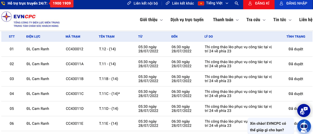 Lịch cắt điện Khánh Hòa trên website của EVNCPC. Ảnh: Khánh An/BNEWS