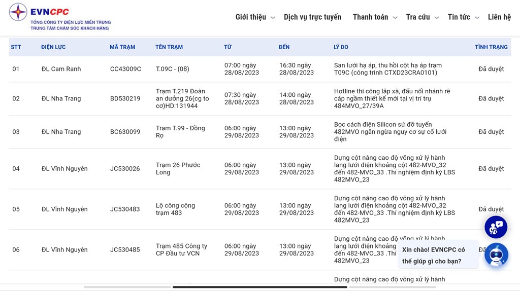 | 4 | ĐL Nha Trang | Trạm T.99 - Đồng Rọ | 06:00 29/08/2023 | 13:00 29/08/2023 | Bọc cách điện Silicon sứ đỡ tuyến 482MVO ngăn ngừa nguy cơ sự cố lưới điện | Đã duyệt |