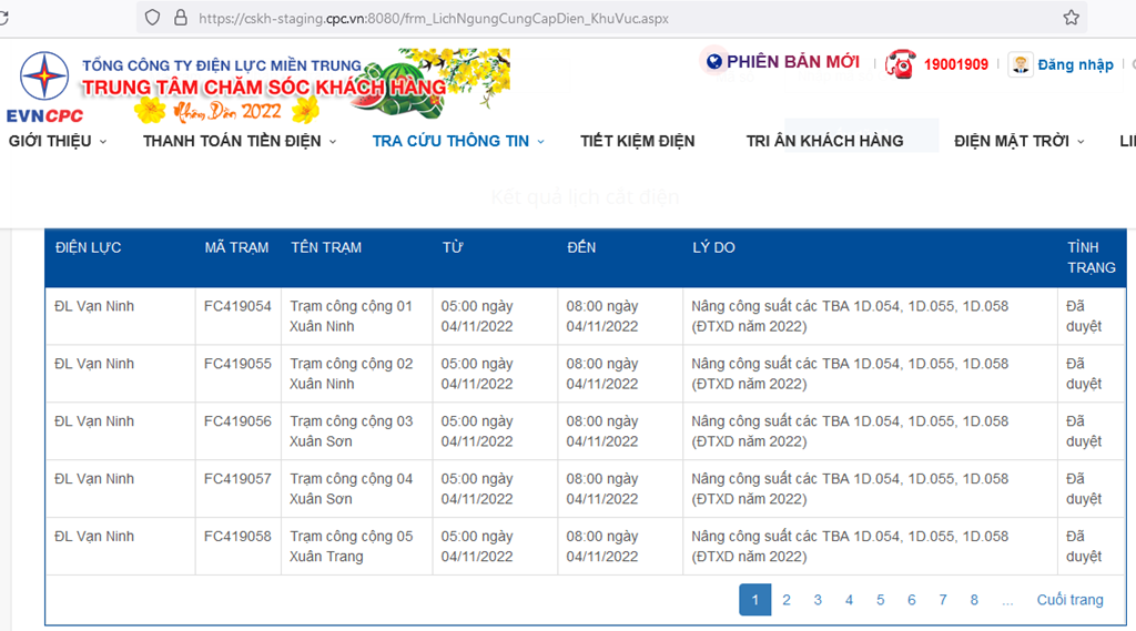 | ĐL Vạn Ninh | FC419055 | Trạm công cộng 02 Xuân Ninh | 05:00 ngày 04/11/2022 | 08:00 ngày 04/11/2022 | Nâng công suất các TBA 1D.054, 1D.055, 1D.058 (ĐTXD năm 2022) | Đã duyệt |