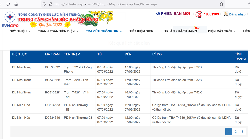 | ĐL Cam Ranh | CC530052 | T.52 - (15) | 07:45 ngày 07/09/2022 | 08:45 ngày 07/09/2022 | Thay TI định kỳ cho KH tại trạm T.52 | Đã duyệt |