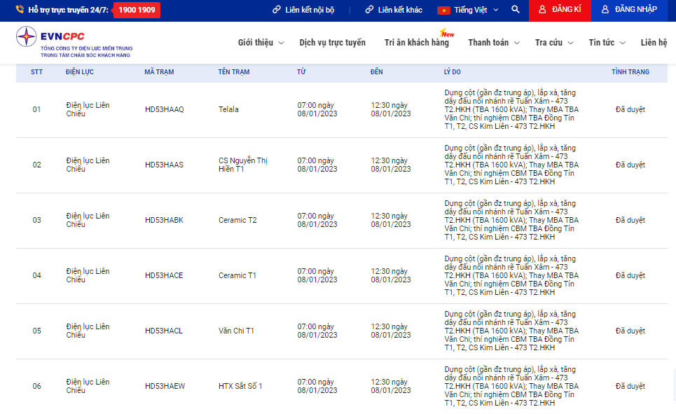 | ĐIỆN LỰC | MÃ TRẠM | TÊN TRẠM | TỪ | ĐẾN | LÝ DO |