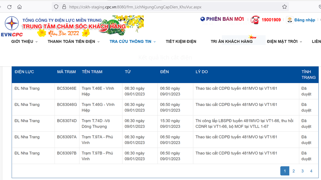 | ĐL Nha Trang | BD63071G | Trạm T.71G - Vĩnh Trung | 06:30 ngày 09/01/2023 | 06:50 ngày 09/01/2023 | Thao tác cắt CDPĐ tuyến 481MVO tại VT1/61 | Đã duyệt |