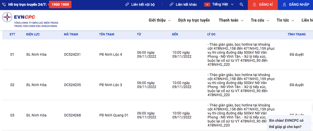 | 2 | ĐL Ninh Hòa | DC524235 | PĐ Ninh Lộc 3 | 06:00 09/11/2022 | 10:00 09/11/2022 | - Tháo giàn giáo, bọc hotline tại khoảng cột 478NIHO_158 đến 471NIHO_159 phục vụ thi công đường dây 500kV NĐ Vân Phong - NĐ Vĩnh Tân.- Xử lý tiếp xúc, buộc lại cổ sứ từ VT 478NIHO_90 đến 478NIHO_220 | Đã duyệt |