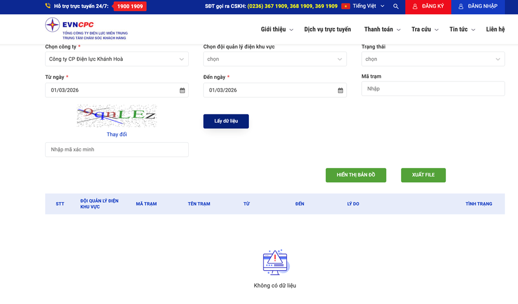 Lịch cắt điện trên địa bàn tỉnh Khánh Hòa ngày mai 1/3/2026, cập nhật vào ngày 28/2/2026 tại website của Tổng công ty Điện lực miền Trung. Ảnh: Bnews/vnanet.vn