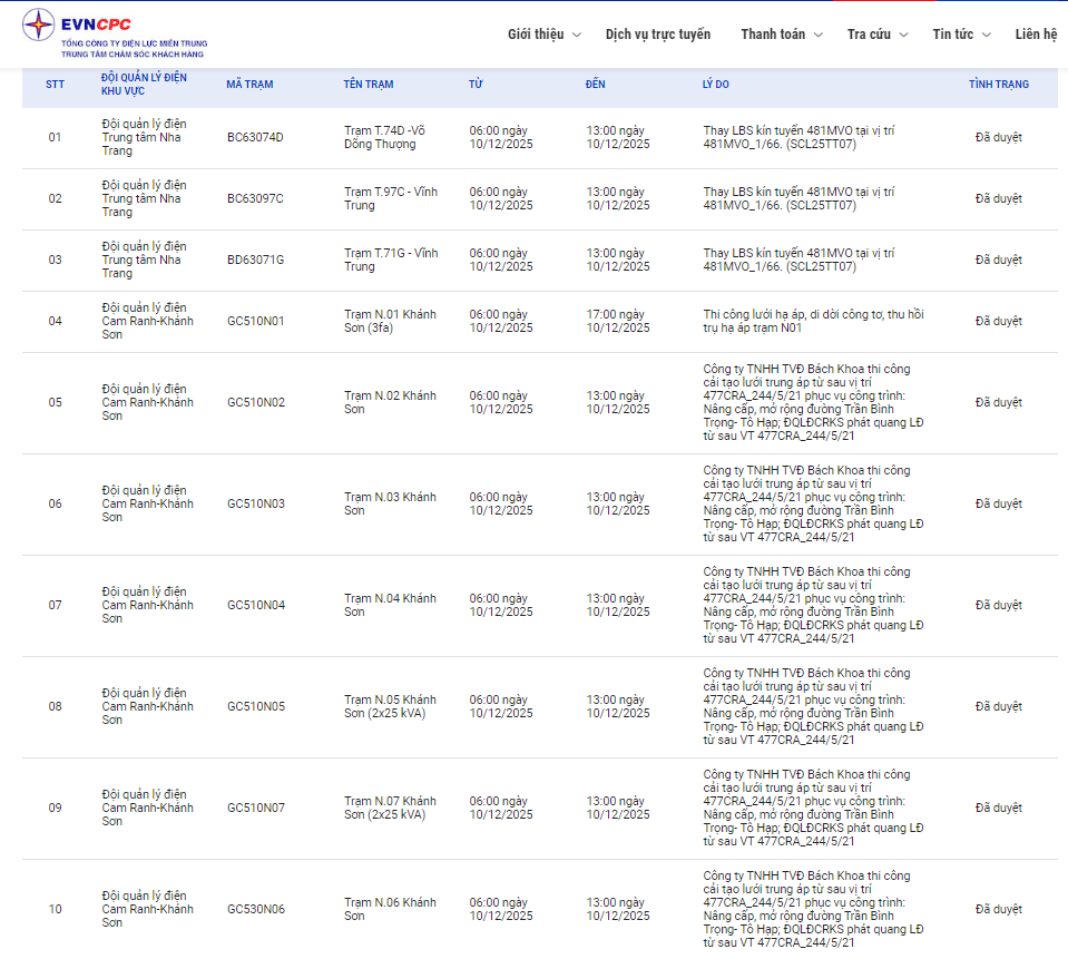 | Đội quản lý điện Trung tâm Nha Trang | BD63071G | Trạm T.71G - Vĩnh Trung | 06:00 10/12/2025 | 13:00 10/12/2025 | Thay LBS kín tuyến 481MVO tại vị trí 481MVO_1/66. (SCL25TT07) | Đã duyệt |