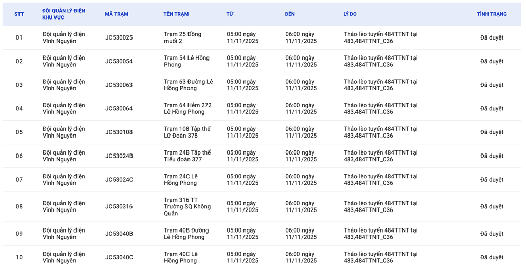 | 10 | Đội quản lý điện Vĩnh Nguyên | JC53040C | Trạm 40C Lê Hồng Phong | 05:00 11/11/2025 | 06:00 11/11/2025 | Tháo lèo tuyến 484TTNT tại 483,484TTNT_C36 | Đã duyệt |