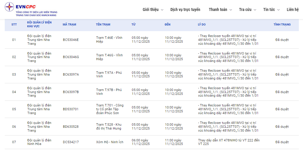 | Đội quản lý điện Trung tâm Nha Trang | BC63097A | Trạm T.97A - Phú Vinh | 05:00 11/12/2025 | 10:00 11/12/2025 | - Thay Recloser tuyến 481MVO tại vị trí 481MVO_1/1. (SCL25TT07)- Xử lý tiếp xúc khoảng dây 481MVO_1/30 đến 1/31 | Đã duyệt |