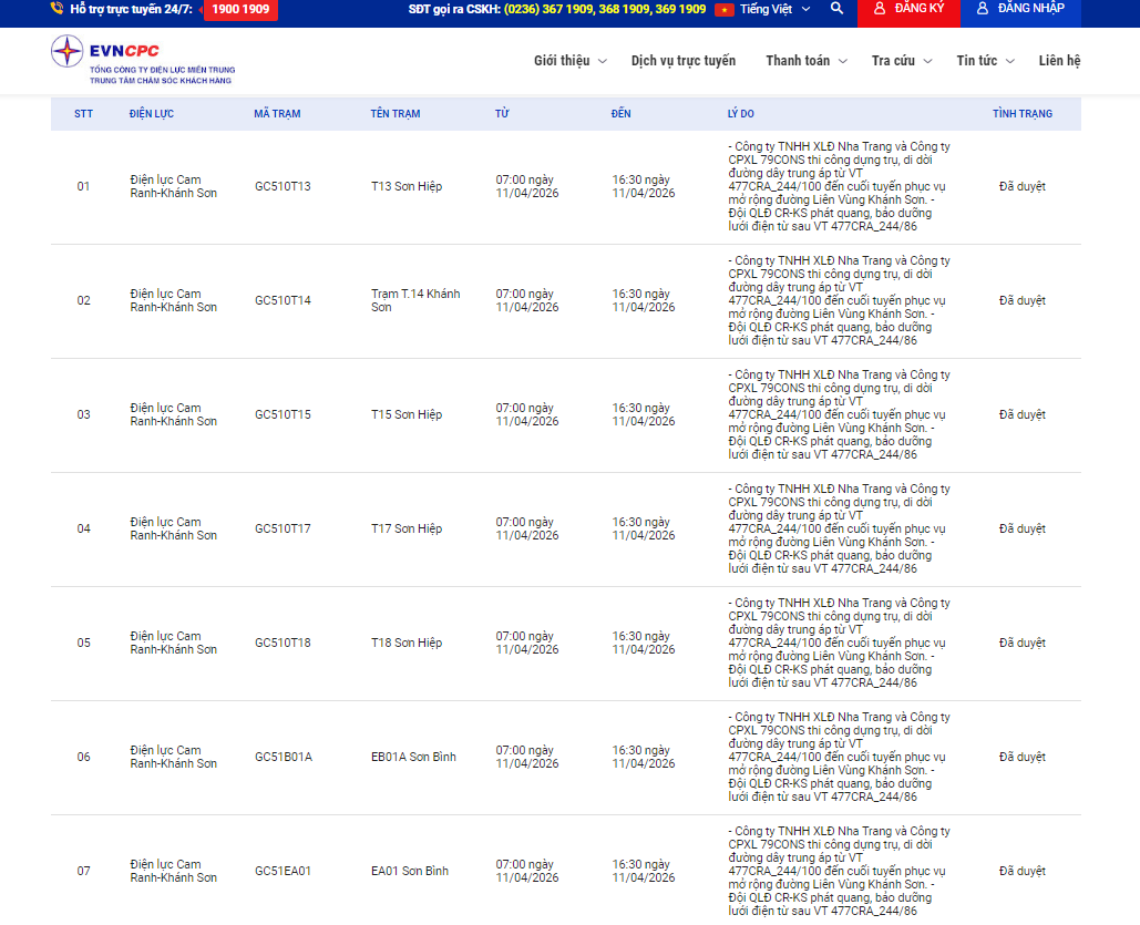 | 8 | Điện lực Cam Ranh-Khánh Sơn | GC51EA02 | EA02 Sơn Bình | 07:00 11/04/2026 | 16:30 11/04/2026 | - Công ty TNHH XLĐ Nha Trang và Công ty CPXL 79CONS thi công dựng trụ, di dời đường dây trung áp từ VT 477CRA_244/100 đến cuối tuyến phục vụ mở rộng đường Liên Vùng Khánh Sơn.- Đội QLĐ CR-KS phát quang, bảo dưỡng lưới điện từ sau VT 477CRA_244/86 | Đã duyệt |