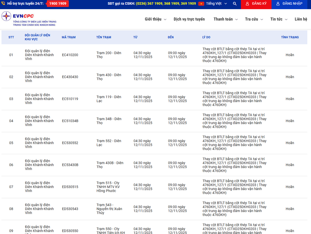| 2 | Đội quản lý điện Diên Khánh-Khánh Vĩnh | EC430430 | Trạm 430 - Diên Thọ | 04:30 12/11/2025 | 09:00 12/11/2025 | Thay cột BTLT bằng cột thép TA tại vị trí 476DKH_127/1 (CTXD25DKH0203 | Thay cột trung áp không đảm bảo vận hành thuộc 476DKH) | Hoãn |