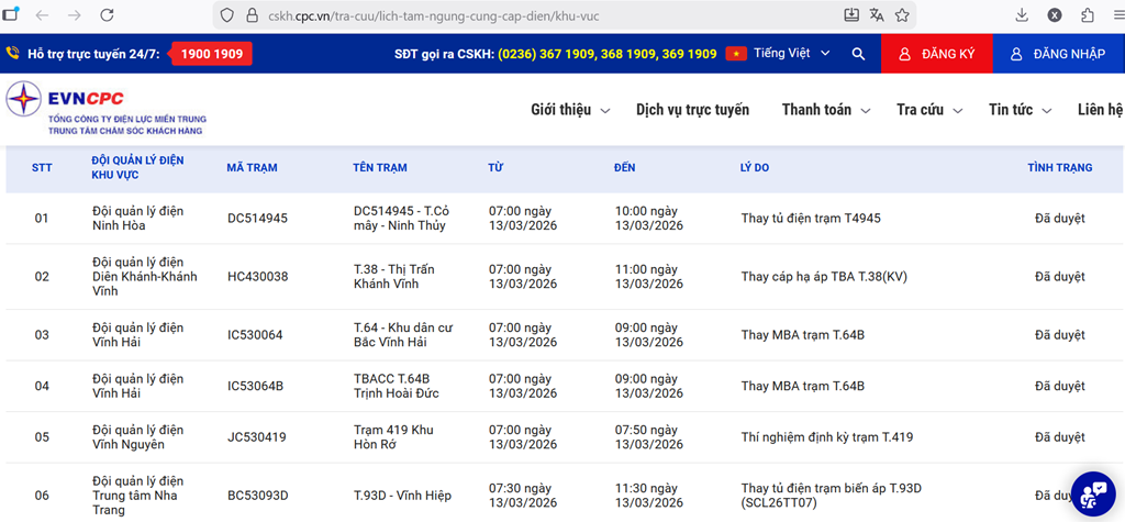 | Đội quản lý điện Cam Ranh-Khánh Sơn | CC4114PD | T14CPĐ - Cam Phước Đông | 07:30 13/03/2026 | 11:30 13/03/2026 | ĐQLĐCRKS thay trụ hạ áp trạm T14CPĐ (SCL26CR6), XNDVĐLKH thí nghiệm định kỳ trạm T14CPĐ | Đã duyệt |