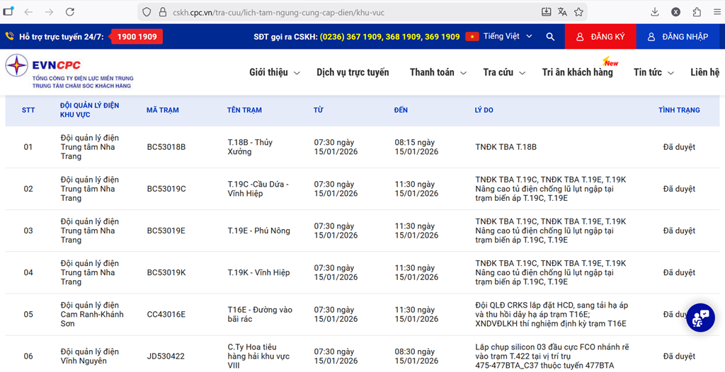 | 2 | Đội quản lý điện Trung tâm Nha Trang | BC53019C | T.19C -Cầu Dứa -Vĩnh Hiệp | 07:30 15/01/2026 | 11:30 15/01/2026 | TNĐK TBA T.19C, TNĐK TBA T.19E, T.19KNâng cao tủ điện chống lũ lụt ngập tại trạm biến áp T.19C, T.19E | Đã duyệt |