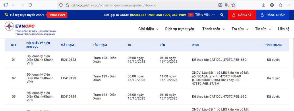 Đội quản lý điện Diên Khánh-Khánh Vĩnh | EC410123 | Trạm 123 - Diên Xuân | 06:00 16/10/2025 | 11:00 16/10/2025 | XNDV: Lắp đặt 1 bộ LBS kiểu kín có kết nối SCADA tại vị trí 473TC.F6B-68 (CTXD25DKH0205)DK: Thay LBS 473TC.F6B_67/1M | Đã duyệt |