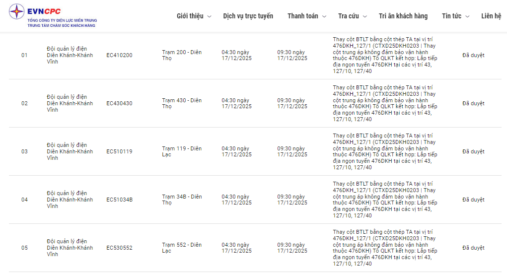 | Đội quản lý điện Diên Khánh-Khánh Vĩnh | EC430430 | Trạm 430 - Diên Thọ | 04:30 17/12/2025 | 09:30 17/12/2025 | Thay cột BTLT bằng cột thép TA tại vị trí 476DKH_127/1 (CTXD25DKH0203 | Thay cột trung áp không đảm bảo vận hành thuộc 476DKH)Tổ QLKT kết hợp: Lắp tiếp địa ngọn tuyến 476DKH tại các vị trí 43, 127/10, 127/40 | Đã duyệt |
