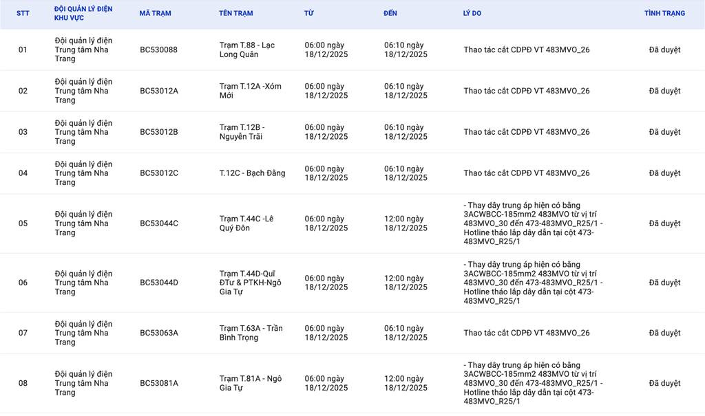 | 2 | Đội quản lý điện Trung tâm Nha Trang | BC53012A | Trạm T.12A -Xóm Mới | 06:00 18/12/2025 | 06:10 18/12/2025 | Thao tác cắt CDPĐ VT 483MVO_26 | Đã duyệt |