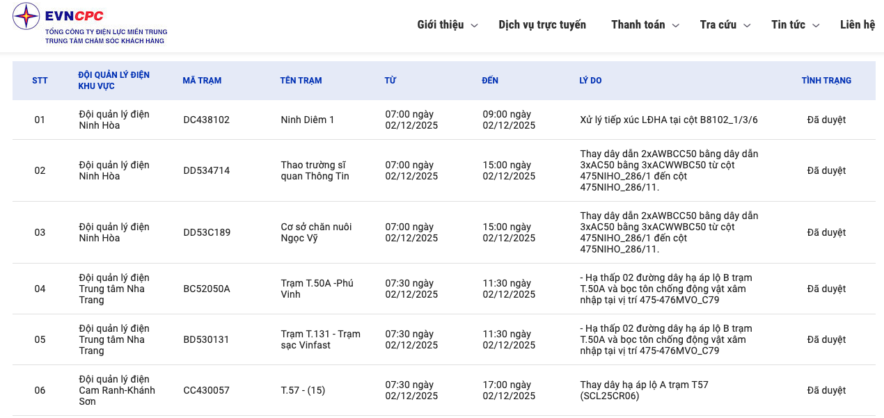 Lịch cắt điện Khánh Hòa ngày 2/12 cập nhật tại website của EVNCPC. Ảnh: BNEWS