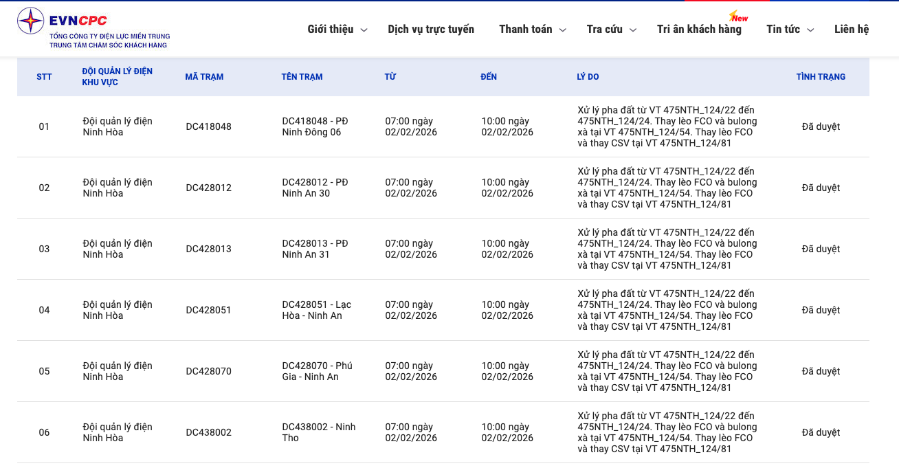 | Đội quản lý điện Ninh Hòa | DC438056 | DC438056 - Ninh An 01 | 07:00 02/02/2026 | 10:00 02/02/2026 | Xử lý pha đất từ VT 475NTH_124/22 đến 475NTH_124/24. Thay lèo FCO và bulong xà tại VT 475NTH_124/54. Thay lèo FCO và thay CSV tại VT 475NTH_124/81 | Đã duyệt |
