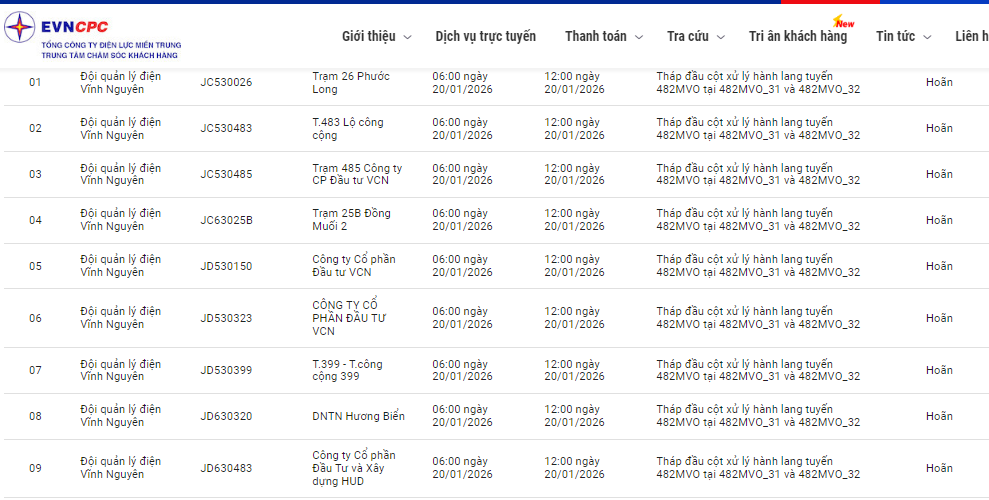 | Đội quản lý điện Vĩnh Nguyên | JC63025B | Trạm 25B Đồng Muối 2 | 06:00 20/01/2026 | 12:00 20/01/2026 | Tháp đầu cột xử lý hành lang tuyến 482MVO tại 482MVO_31 và 482MVO_32 | Hoãn |