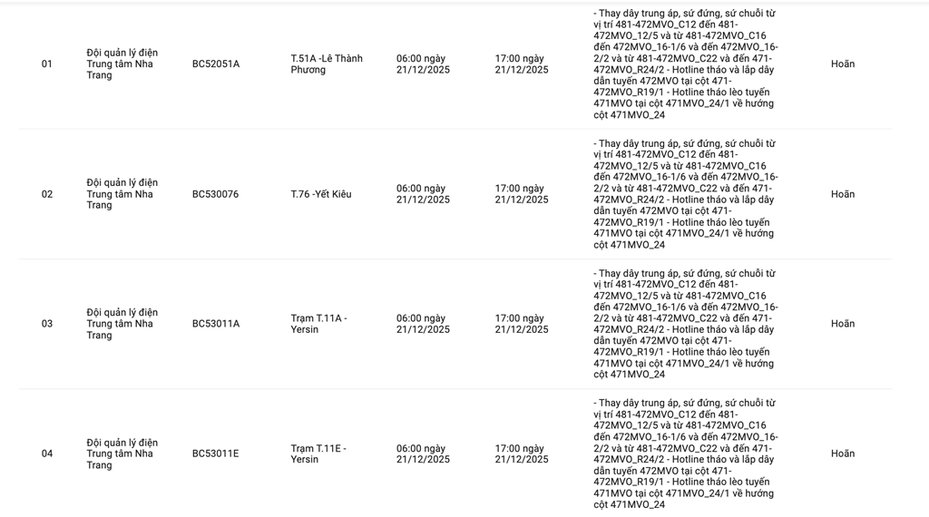 | 6 | Đội quản lý điện Trung tâm Nha Trang | BC53051B | Trạm T.51B -Hoàng Văn Thụ | 06:00 21/12/2025 | 17:00 21/12/2025 | - Thay dây trung áp, sứ đứng, sứ chuỗi từ vị trí 481-472MVO_C12 đến 481-472MVO_12/5 và từ 481-472MVO_C16 đến 472MVO_16-1/6 và đến 472MVO_16-2/2 và từ 481-472MVO_C22 và đến 471-472MVO_R24/2- Hotline tháo và lắp dây dẫn tuyến 472MVO tại cột 471-472MVO_R19/1- Hotline tháo lèo tuyến 471MVO tại cột 471MVO_24/1 về hướng cột 471MVO_24 | Hoãn |