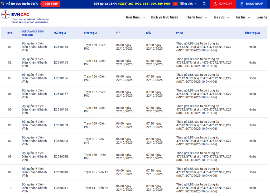 4 | Đội quản lý điện Diên Khánh-Khánh Vĩnh | EC510157 | Trạm 157 - Diên Phú | 06:00 22/10/2025 | 07:30 22/10/2025 | Tháo gỡ LBS của tụ bù trung áp 476T2.NTR tại vị trí 475-476T2.NTR_C27 (MCT: SCTX-2025-10-DKH-06) | Hoãn |