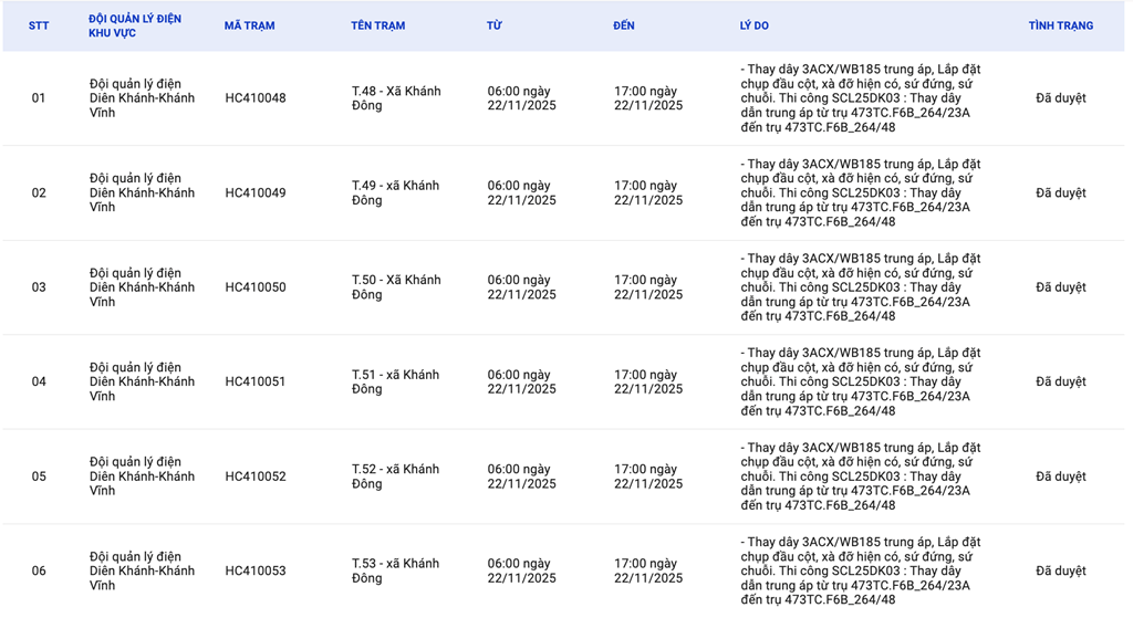 | 6 | Đội quản lý điện Diên Khánh-Khánh Vĩnh | HC410053 | T.53 - xã Khánh Đông | 06:00 22/11/2025 | 17:00 22/11/2025 | - Thay dây 3ACX/WB185 trung áp, Lắp đặt chụp đầu cột, xà đỡ hiện có, sứ đứng, sứ chuỗi.Thi công SCL25DK03 : Thay dây dẫn trung áp từ trụ 473TC.F6B_264/23A đến trụ 473TC.F6B_264/48 | Đã duyệt |