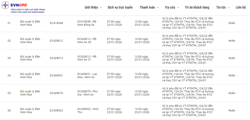 | Đội quản lý điện Ninh Hòa | DC428012 | DC428012 - PĐ Ninh An 30 | 07:00 23/01/2026 | 10:00 23/01/2026 | Xử lý pha đất từ VT 475NTH_124/22 đến 475NTH_124/24. Thay lèo FCO và bulong xà tại VT 475NTH_124/54. Thay lèo FCO và thay CSV tại VT 475NTH_124/81 | Hoãn |