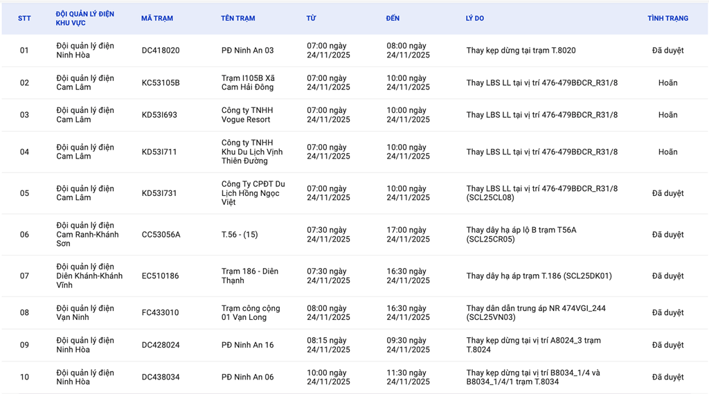 | 2 | Đội quản lý điện Cam Lâm | KC53105B | Trạm I105B Xã Cam Hải Đông | 07:00 24/11/2025 | 10:00 24/11/2025 | Thay LBS LL tại vị trí 476-479BĐCR_R31/8 | Hoãn |