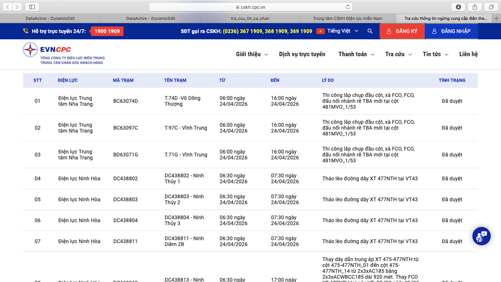 | 2 | Điện lực Trung tâm Nha Trang | BC63097C | T.97C - Vĩnh Trung | 06:00 24/04/2026 | 16:00 24/04/2026 | Thi công lắp chụp đầu cột, xà FCO, FCO, đấu nối nhánh rẽ TBA mới tại cột 481MVO_1/53 | Đã duyệt |