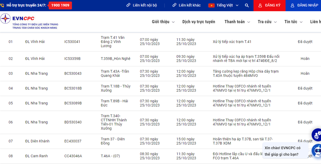 | 4 | ĐL Nha Trang | BC53018B | Trạm T.18B - Thủy Xưởng | 07:30 25/10/2023 | 12:00 25/10/2023 | Hotline Thay 03FCO nhánh rẽ tuyến 476MVO tại vị trí trụ 476MVO_12/1 | Đã duyệt |