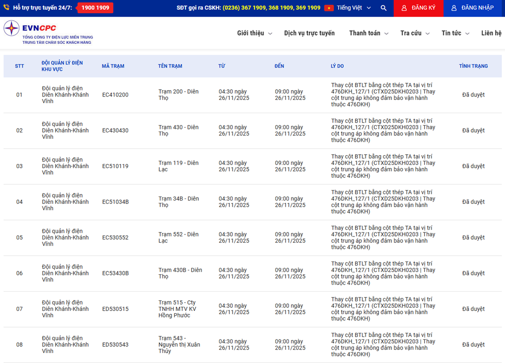 | 2 | Đội quản lý điện Diên Khánh-Khánh Vĩnh | EC430430 | Trạm 430 - Diên Thọ | 04:30 26/11/2025 | 09:00 26/11/2025 | Thay cột BTLT bằng cột thép TA tại vị trí 476DKH_127/1 (CTXD25DKH0203 | Thay cột trung ápkhông đảm bảo vận hành thuộc 476DKH) | Đã duyệt |
