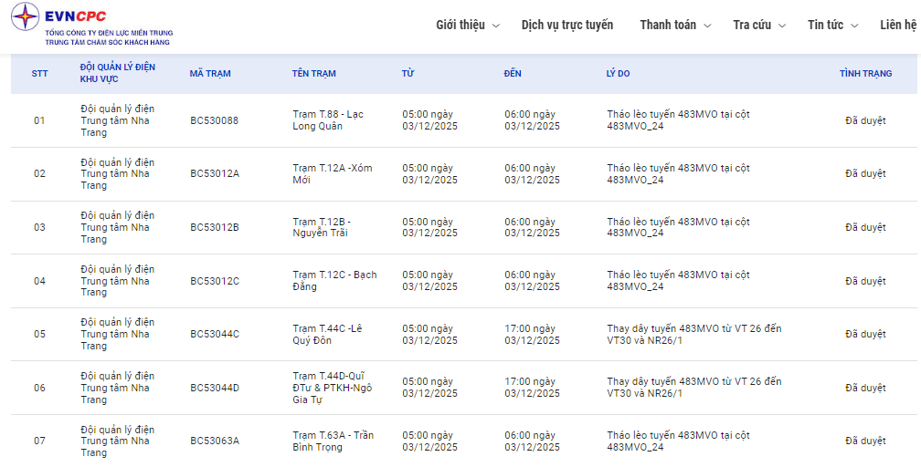 | Đội quản lý điện Trung tâm Nha Trang | BC53081E | Trạm T.81E - Ngô Gia Tự | 05:00 03/12/2025 | 17:00 03/12/2025 | Thay dây tuyến 483MVO từ VT 26 đến VT30 và NR26/1 | Đã duyệt |