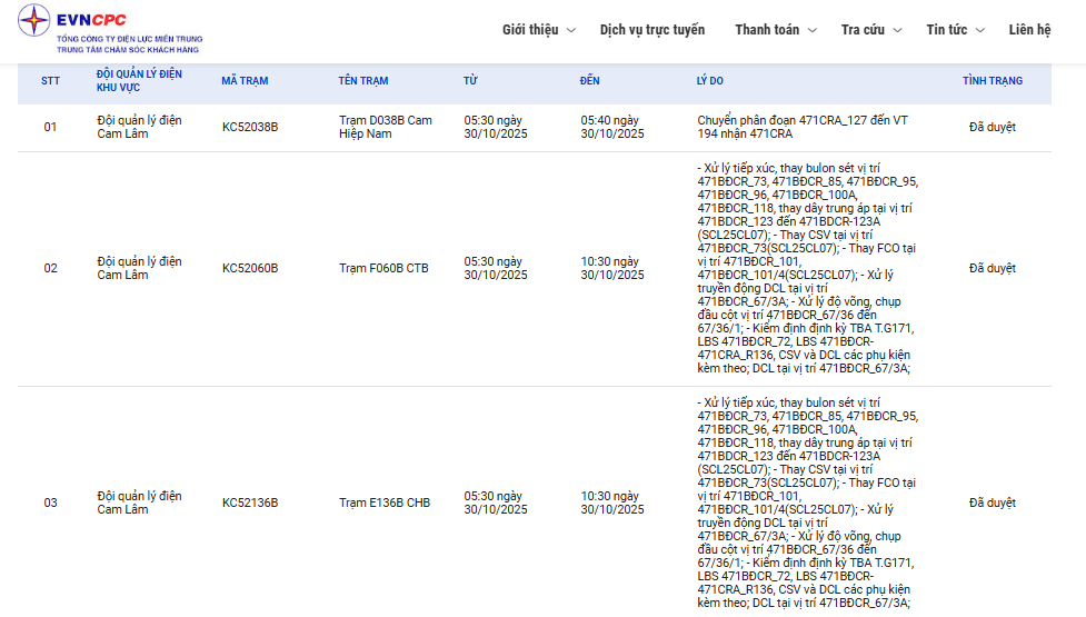 | Đội quản lý điện Cam Lâm | KC53042D | Trạm E042D Cam Hiệp Bắc | 05:30 30/10/2025 | 10:30 30/10/2025 | - Xử lý tiếp xúc, thay bulon sét vị trí 471BĐCR_73, 471BĐCR_85, 471BĐCR_95, 471BĐCR_96, 471BĐCR_100A, 471BĐCR_118, thay dây trung áp tại vị trí 471BDCR_123 đến 471BDCR-123A (SCL25CL07);- Thay CSV tại vị trí 471BĐCR_73(SCL25CL07);- Thay FCO tại vị trí 471BĐCR_101, 471BĐCR_101/4(SCL25CL07);- Xử lý truyền động DCL tại vị trí 471BĐCR_67/3A;- Xử lý độ võng, chụp đầu cột vị trí 471BĐCR_67/36 đến 67/36/1;- Kiểm định định kỳ TBA T.G171, LBS 471BĐCR_72, LBS 471BĐCR-471CRA_R136, CSV và DCL các phụ kiện kèm theo; DCL tại vị trí 471BĐCR_67/3A; | Đã duyệt |