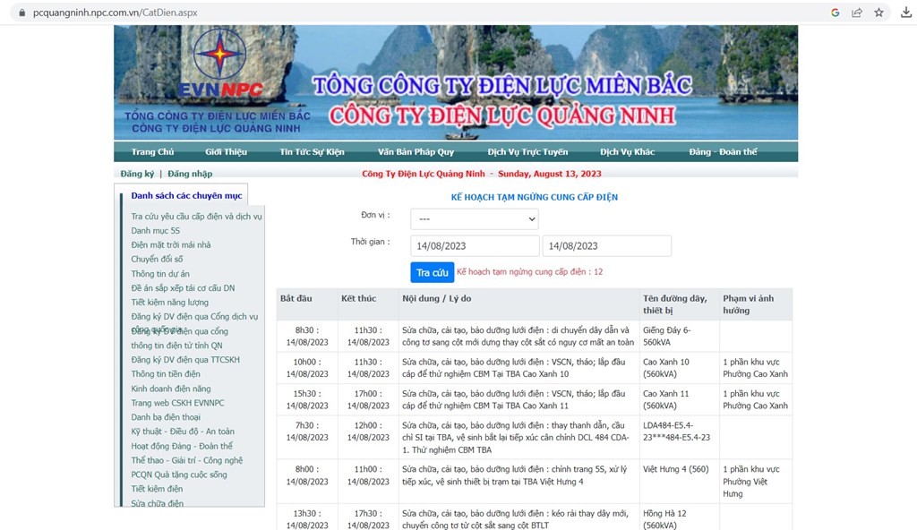 Công ty Điện lực Quảng Ninh thông báo về kế hoạch cắt điện trên toàn địa bàn tỉnh trong ngày 14/8.
