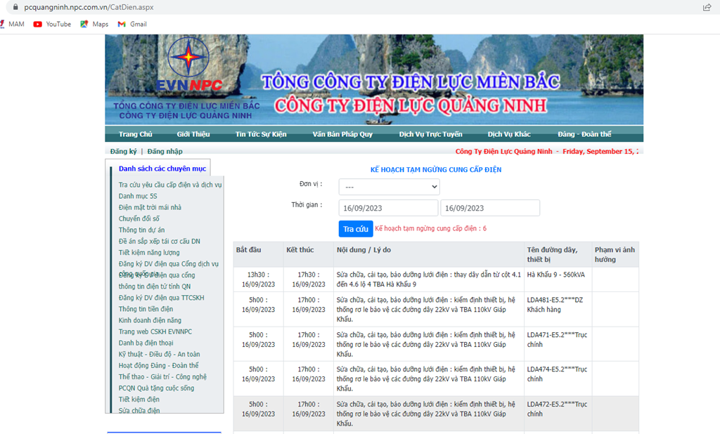 - lịch cắt điện quảng ninh ngày mai 16/9